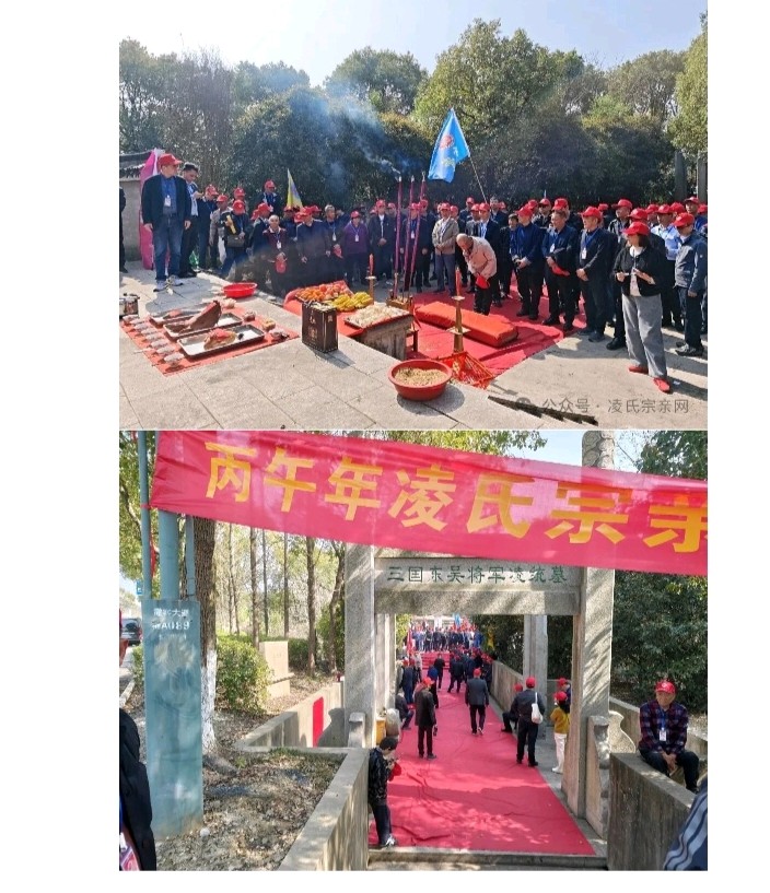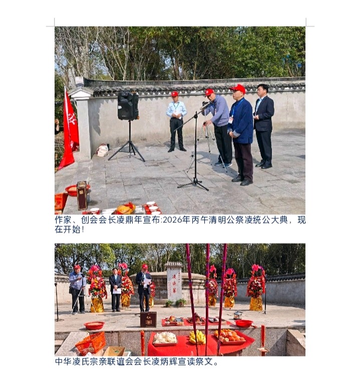 肃穆启典,共缅先祖 仪式严格遵循传统礼制,依次进行恭请祖灵、敬献香烛、敬献花篮、敬奉松柏、巡献爵酒、恭读祭文、全体再拜、分批瞻仰、恭送祖灵等环节。凌氏宗亲代表依次上台,通过敬香、献花、献酒等礼仪,表达对凌统公的深切追思。其中,中华凌氏宗亲联谊会会长凌炳辉恭读《迎神词》,并在最后恭读祭文,告慰先公功绩。 维公元二零二六年,岁次丙午,仲春之月,清明在望。中华凌氏宗亲联谊会,偕海内外各地宗亲代表,谨以清酌庶馐、香花雅乐之仪,致祭于东汉故都亭侯、东吴偏将军凌统公之灵前曰: 呜呼!大江浩浩,钟山巍巍。吴会故地,英灵长栖。缅我祖公,诞于余杭。禀性忠烈,志气昂藏。弱冠从戎,追随孙权。冲锋陷阵,功著疆场。合肥之役,公奋神威。亲护主君,浴血重围。国士之风,名将风范。惜乎天年,壮岁而终。吴主流涕,士庶哀恫。青阳之野,悟空寺旁。千秋俎豆,享祀一方。 今我族裔,四海来同。值此清明,虔修祀典。联谊十载,丕振宗风。追远报本,心香一瓣。肃立墓前,追思遐想。祖德宗功,山高水长。公之忠勇,乃族之光。公之仁信,家风所倡。今呈薄奠,非仅牲醪。继志述事,是承是祷。愿我族人,思源不忘。砥砺德行,兴业齐家。敦亲睦邻,报效国邦。承先启后,世代永昌。 灵其有知,伏维歆格!尚飨!